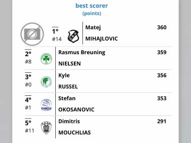 Το "κανόνι" του ΟΦΗ, Ματέι Μιχαίλοβιτς, αναδείχθηκε πρώτος σκόρερ της κανονικής διάρκειας του πρωταθλήματος, με 360 πόντους, ένα παραπάνω απο τον Δανό διαγώνιο του Παναθηναϊκού Νίλσεν, που κατέγραψε 359 και τρίτο τον Αμερικάνο Ράσελ του Μίλωνα, που πέτυχε 356 πόντους, αλλά αποχώρησε πρόσφατα απο την Ελληνική Λίγκα, για να μετακομίσει στην Κορέα και πολύ κοντά στην τέταρτη θέση τον Σέρβο διαγώνιο Οκοσάνοβιτς της Κηφισιάς με 353.