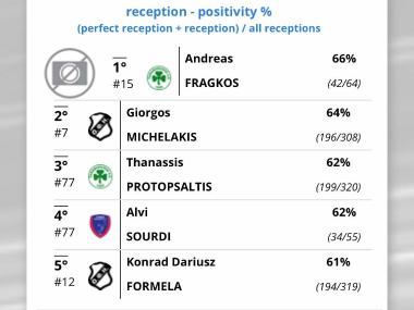 Στην πρώτη θέση στην υποδοχή, τερμάτισε ο ακραίος του Παναθηναϊκου, Ανδρέας Φράγκος, με 66%, αλλά πολύ λιγότερες υποδοχές απο τον παίκτη του ΟΦΗ (42/64 ο Φράγκος, 196/308 ο Μιχελάκης). Τρίτος, ο ακραίος του ΠΑΟ Θανάσης Πρωτοψάλτης με 62% (199/320).