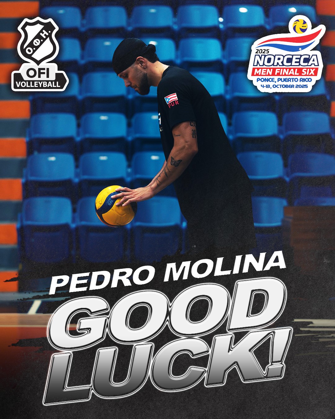 Ο διεθνής ακραίος του ΟΦΗ, Πέδρο Μολίνα, αναχώρησε για το Πουέρτο Ρίκο, προκειμένου να αγωνιστεί με την Εθνική ομάδα της χώρας του, της οποίας είναι και αρχηγός, στο NORCECA Men’s Final Six, που διεξάγεται στην πόλη Πόνσε του Πουέρτο Ρίκο, απο 4-13 Οκτωβρίου.